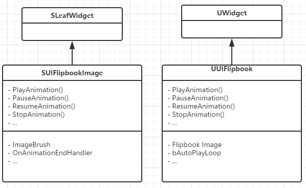 这个时候UE4提供源码的优势就体现了。我们可以通过继承相似功能的控件来实现我们想要的效果。这里我们选择了SLeafWidget做父类来创建我们需要的SUIFlipbookImage。另外我也将其用UWidget封装起来这样就可以直接在UMG中调用了。类图如下: