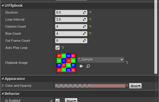 以下是最终我们的UIFlipbook控件在UMG中使用的时候提供的选项,运用它可以实现开头的gif图中展示的效果了。