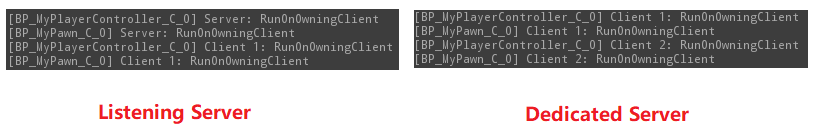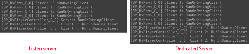 首先就RunOnOwningClient方式而言,它必须调用在Server上Context中被调用,否则会被当成一个普通的事件被调用。比如下图的打印,存在两个Pawn,并在Pawn的BeginPlay