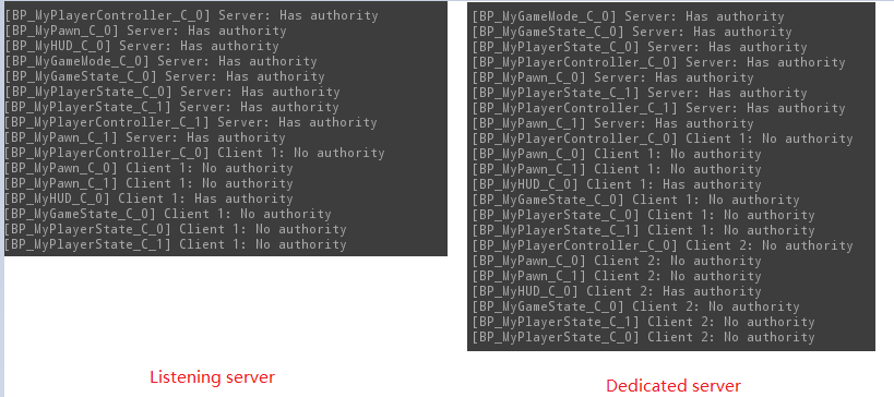 就是判断是Server还是Client。这是不准确的。比如HUD类似的对象,只在owning client上存在,即其在且仅在owning client上有authority。而且我前面提到的要注意分清楚使用的是Dedicated Server还是Listening Server模式,这是因为那个Listen Server的缘故,在Server扮演Client时,对所有拥有的对象都有Authority。具体可以看下图,均是在BeginPlay