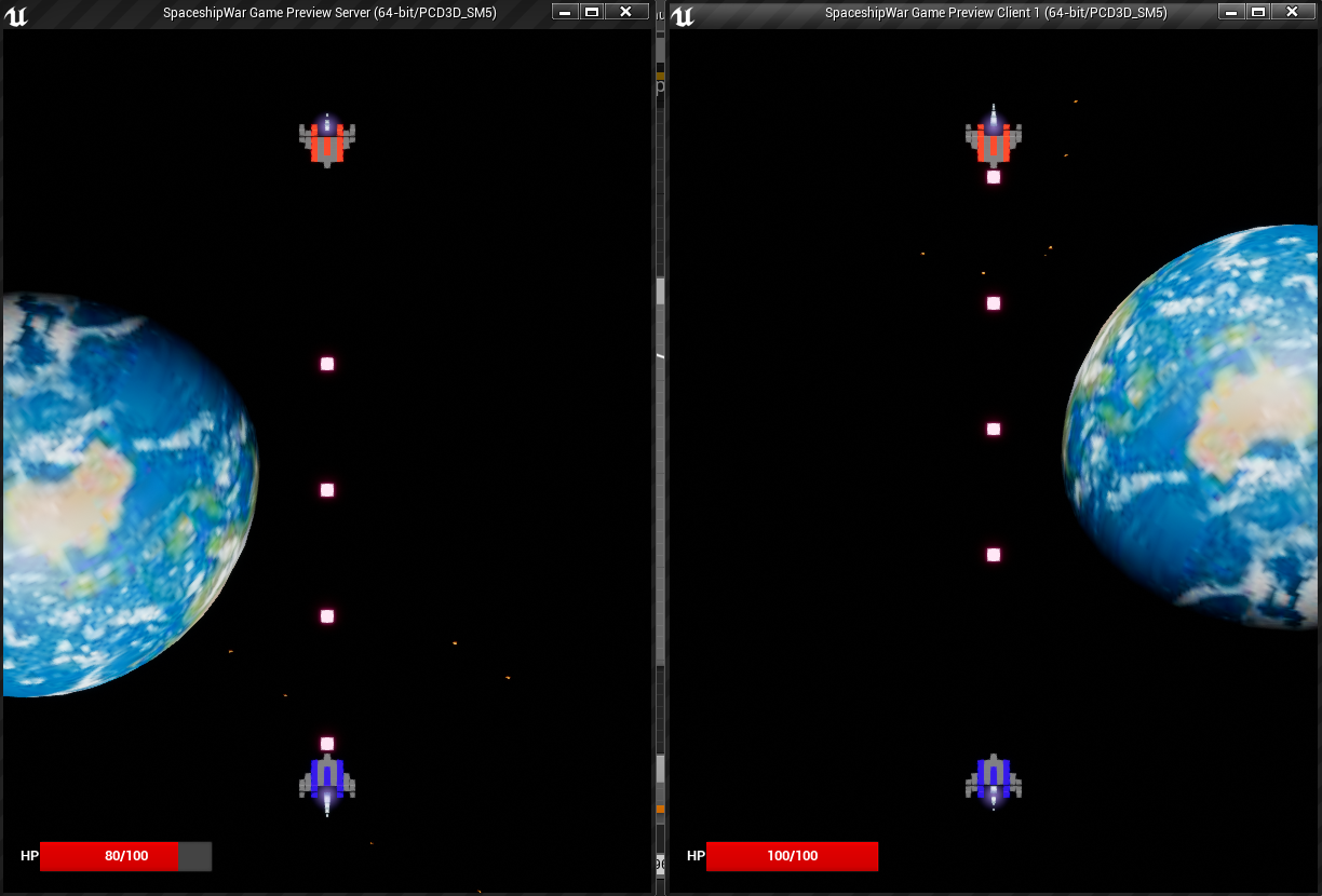 这里不过多的累述具体的代码细节,想要了解更多可以直接查看(源码)(https://github.com/ArcEcho/SpaceshipWar)。且先声明下面的讨论建立在我们使用的是Listening server模式下的,因为这个示例中即使用这种模式。